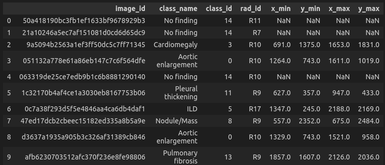 After joining the competition and reading the description, looking at data, and understanding the evaluation, you can fire up your favorite python editor and start importing packages. Though this competition has a dataset composed of dicom images that are over 128 gb in size, some nice person wrote a script and saved the dataset to a more palatable 50gb of png images. Now on to looking at the data. The data is comprised of a csv file with the image id and classification data, along with other bounding box metadata that we won't look at at this point.
