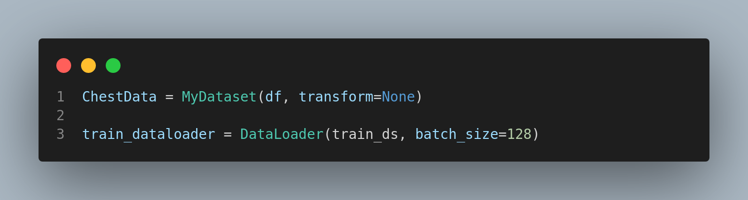 Now that we determined how the data is going to be collected for processing(the dataset class, we are going to initialize the class by assign it to a variable and the passing that variable to a variable that initialized a Dataloader class. Remember your python training, the class is just the blueprint while actual object is the variable that became the physical function of the blueprint.