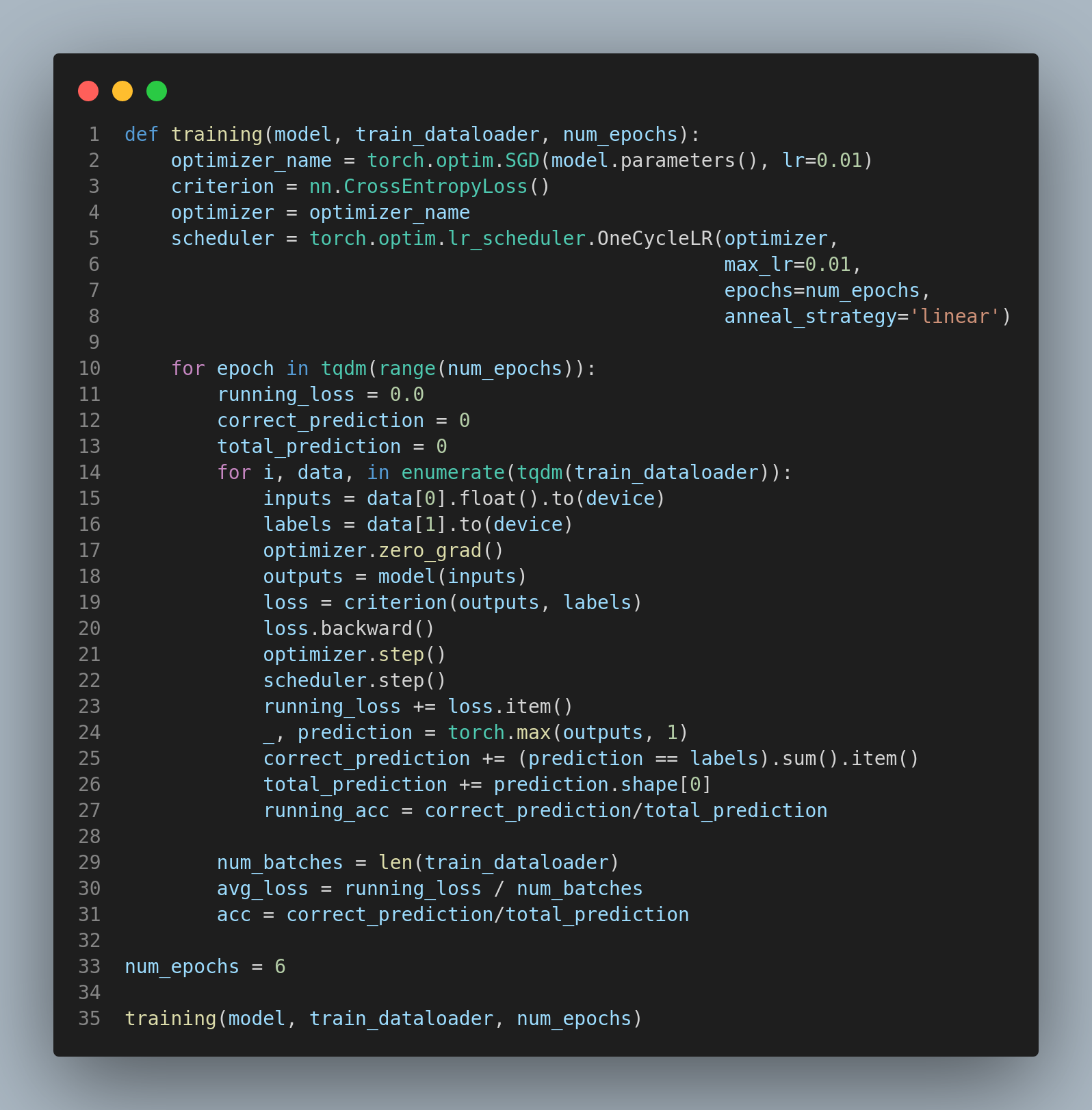 The model can't do everything on its own so there needs to be a way to have the data enter the model more than once and adjust the paramerters of the model based on a metric, the loss function. This is where the training function comes. It takes all the other functions that we created and passes the full dataset through the model multiple times and calculates an accuracy, though it truth it could be and should be another metric